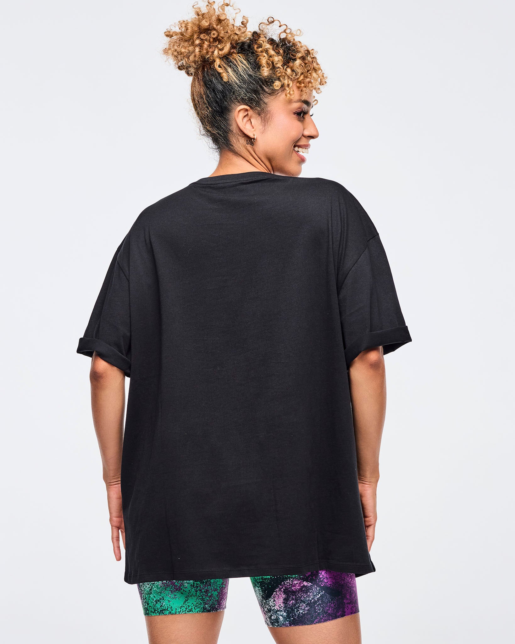 This men's crew neck tee features a rib-knit neckline and a unique Zumba-exclusive graphic on the front. Designed with an oversized fit and extended length, it offers comfortable, stylish wear for any casual occasion.
