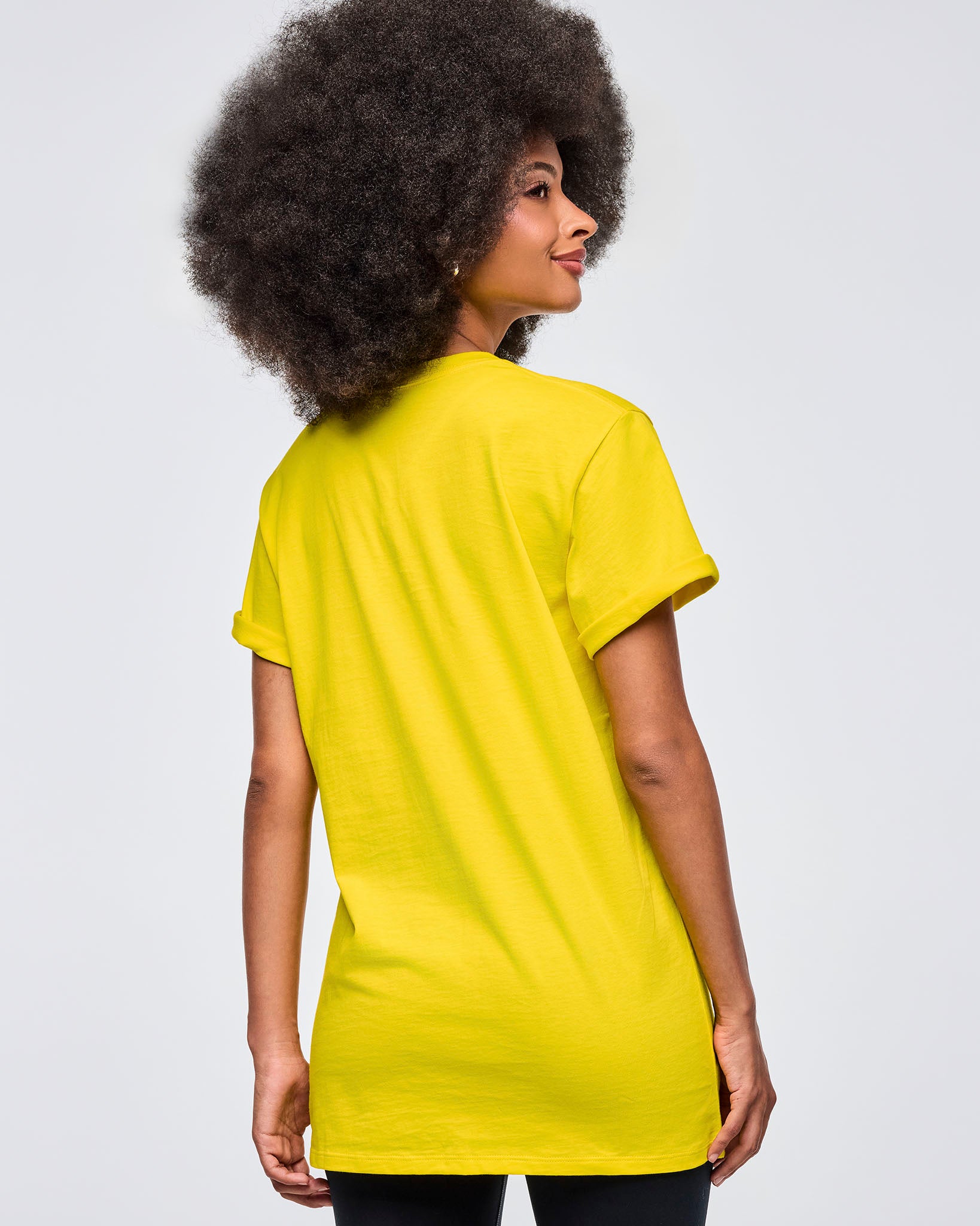 This unisex crew neck tee features a rib-knit collar and offers an easy, comfortable fit with a longer length for versatile styling.