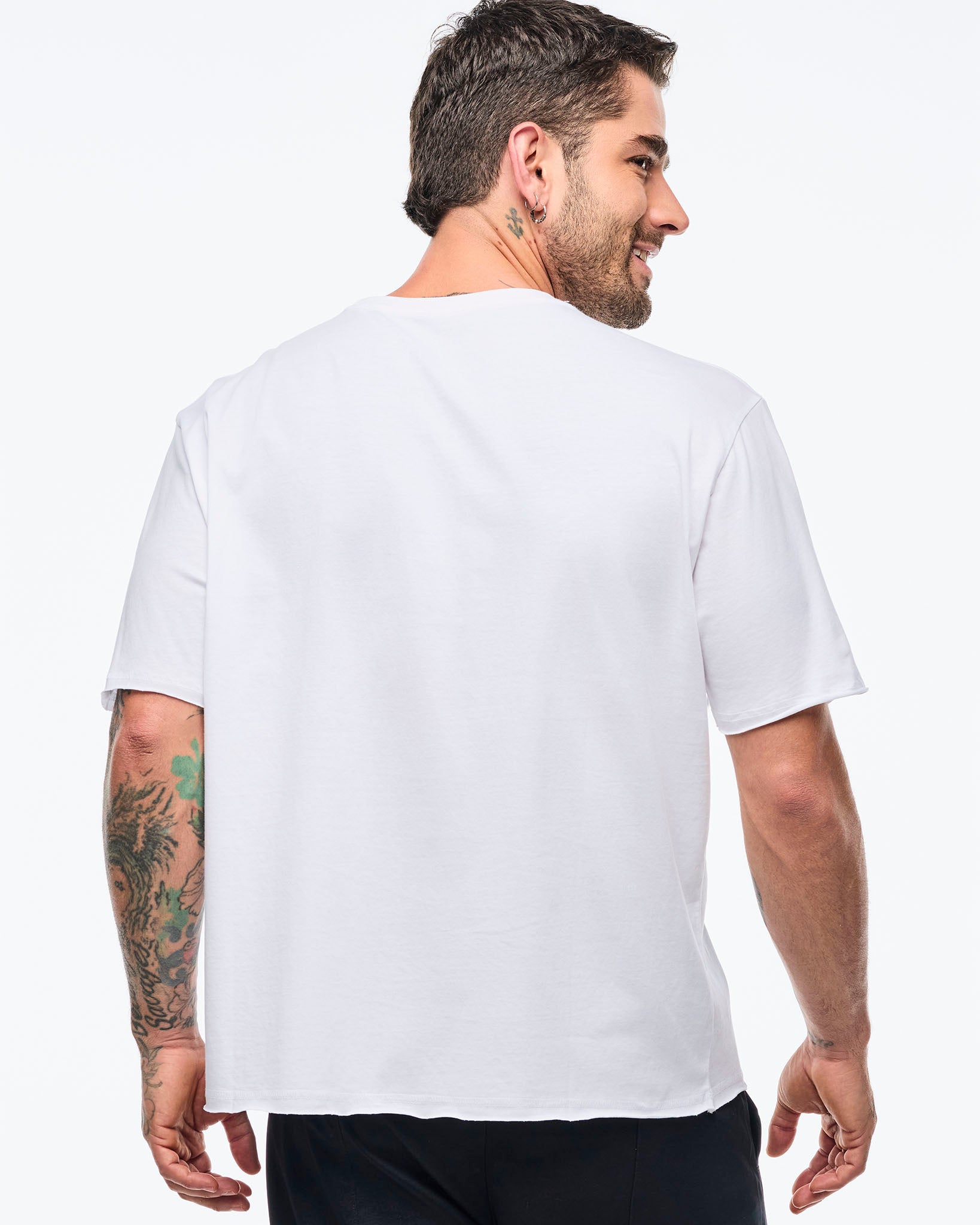 This oversized boxy top features a rib-knit neckline and raw cut edges at the sleeves and hem for an edgy, effortless style. Finished with a bold Zumba-exclusive oversized graphic on the front, it offers a relaxed fit and extended length for comfortable, confident wear.