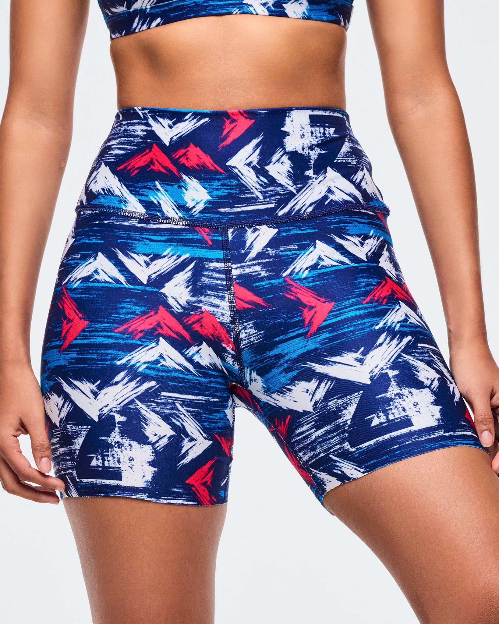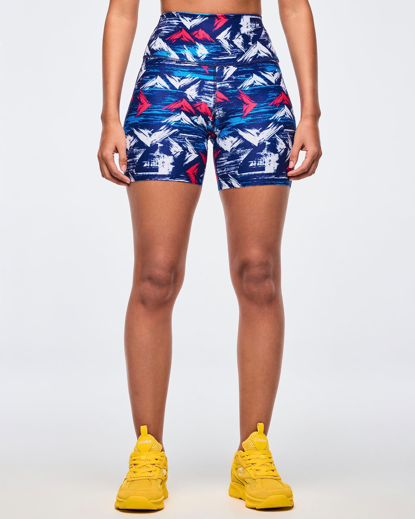 These blue and white high-waisted biker shorts feature a 5 1/2" inseam and raw edges on the leg openings for a comfortable, flattering fit. The fold-over waistband contains no internal elastic, ensuring smooth wear. With a slim fit and exclusive Zumba all-over print, these shorts offer stylish performance in a short length.