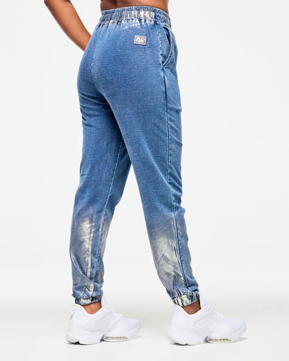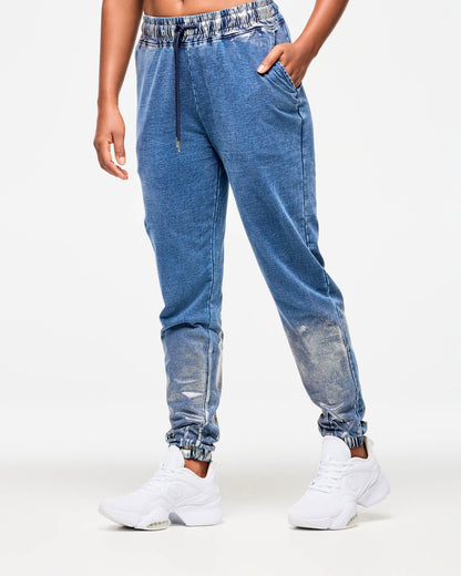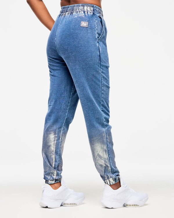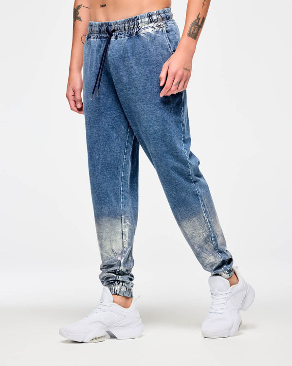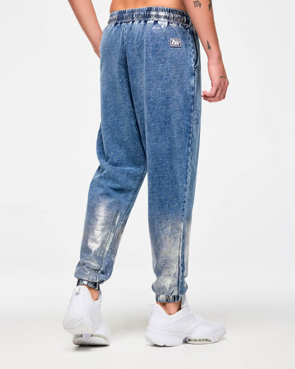 - One of a kind denim-look garment wash. Plus hand made distressed metallic foil on waist and lower legs. Each garment is unique!