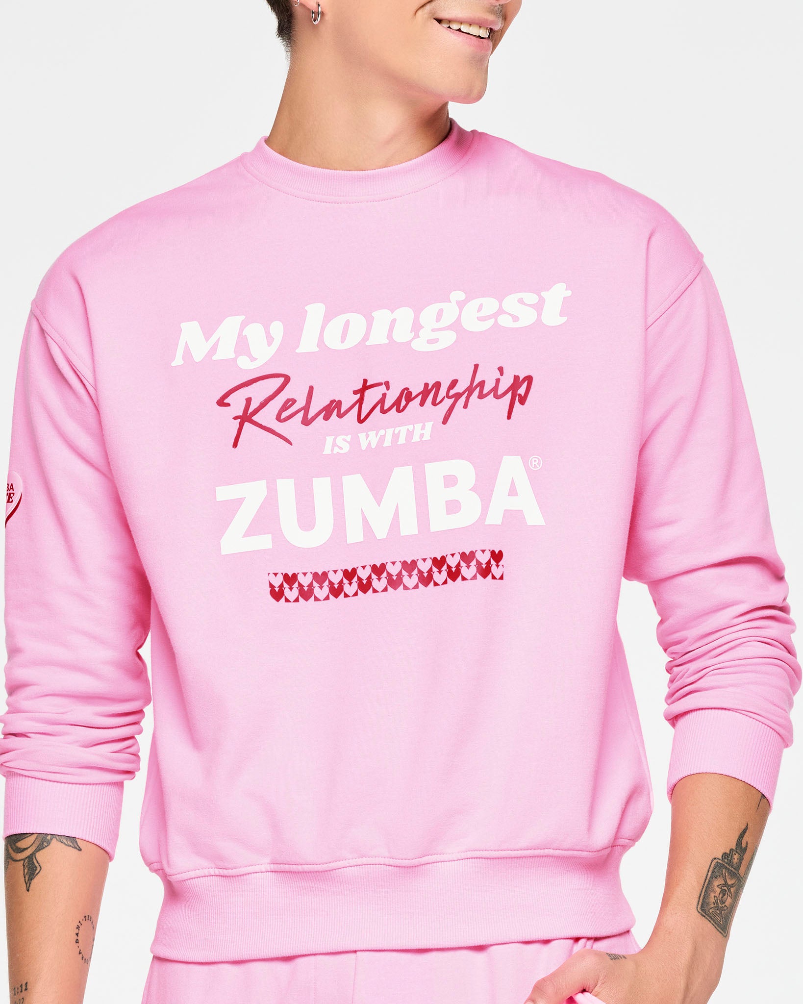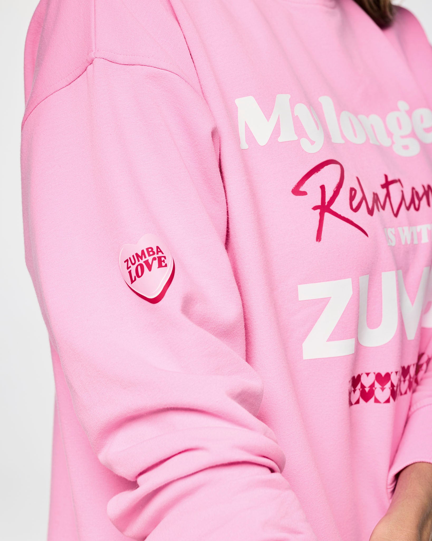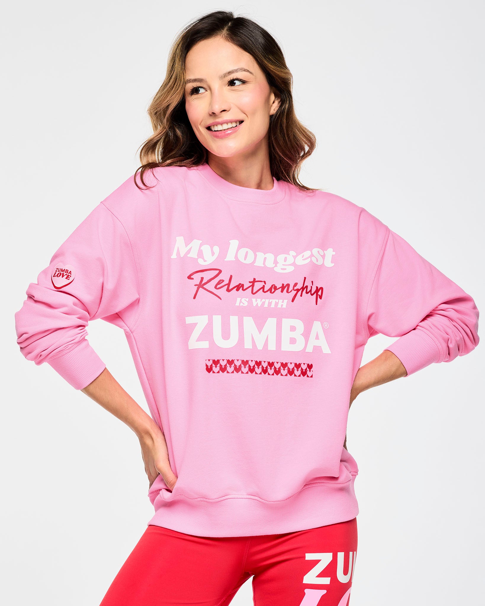 This Zumba Love oversized pullover sweatshirt features a graphic print exclusive to Zumba, along with a rib knit collar, cuffs, and bottom band for added style. Made with a tri-blend French Terry fabric, it offers an oversized fit and a longer length for ultimate comfort and fashion.