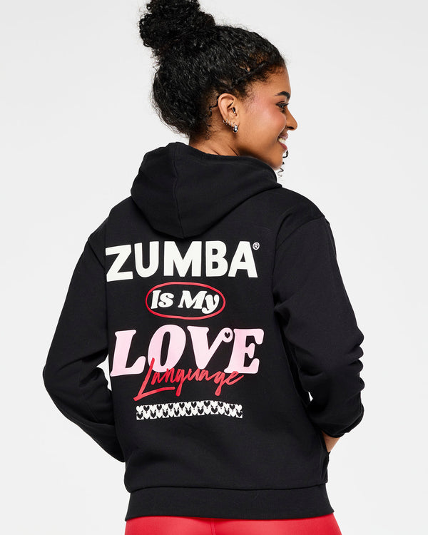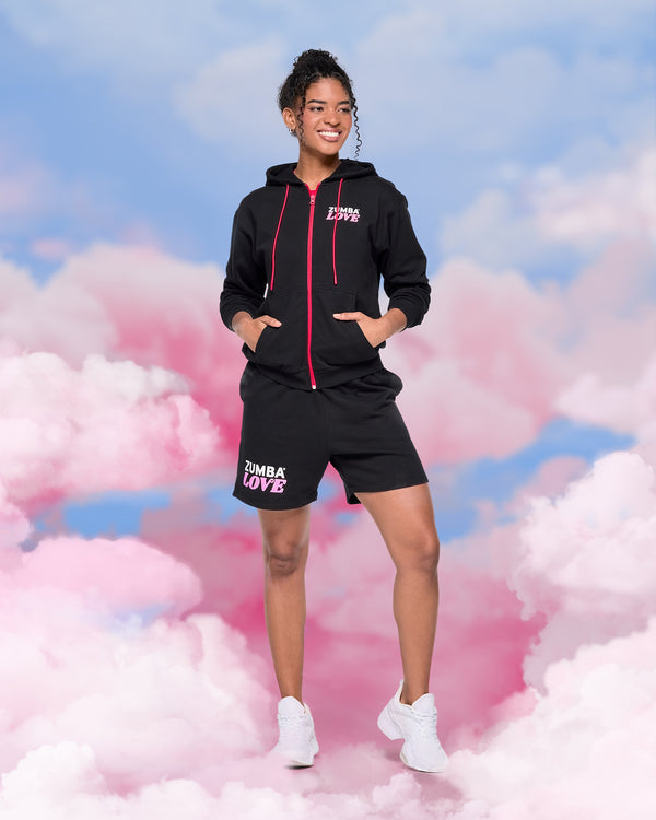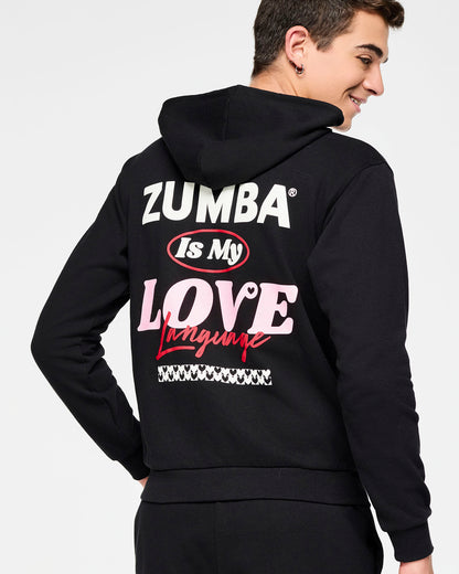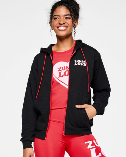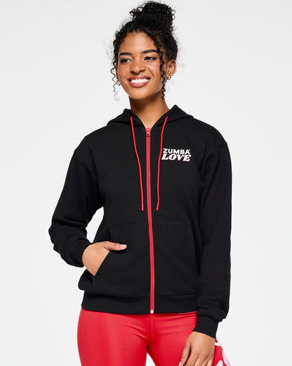 Stay cozy and stylish with this Zumba Love Zip Up Hoodie. Featuring functional kangaroo pockets and a drawcord hood, this relaxed-fit hoodie is made from comfortable cotton French Terry. The rib knit cuffs and bottom band add a touch of style, while the exclusive graphic prints on the front and back add a pop of personality. This long length hoodie is perfect for any Zumba enthusiast looking to show off their love for the dance fitness program!