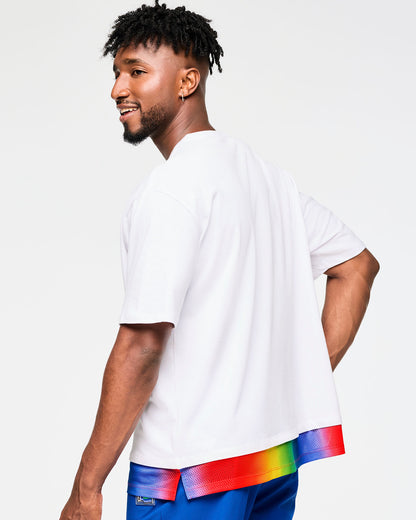 Experience the ultimate in comfort and style with our Zumba Men's Crew Neck Tee. Featuring a unique double-layered mesh hem panel, rib knit neckband, and side vents for added ventilation, this tee is designed to keep you feeling cool and looking bold. Our exclusive front graphic print adds a touch of flair, while the oversized fit and long length provide maximum coverage and freedom of movement.