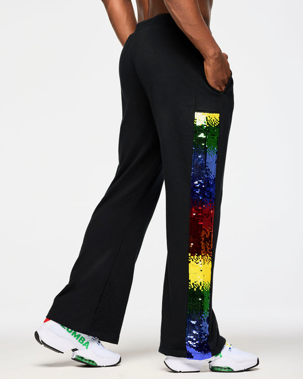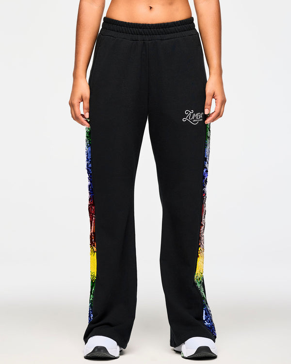 Experience the ultimate blend of comfort and style with our Zumba Wide Leg Sweatpants With Sequin Panels. Featuring 30 1/2" inseam for maximum coverage, these sweatpants also showcase stunning sequined French terry side panels in a gradient rainbow artwork. The encased elastic waistband and inseam pockets provide convenience while the embroidered logo on the front hip adds a touch of sophistication. With an easy fit and long length, these sweatpants are a must-have addition to your wardrobe.
