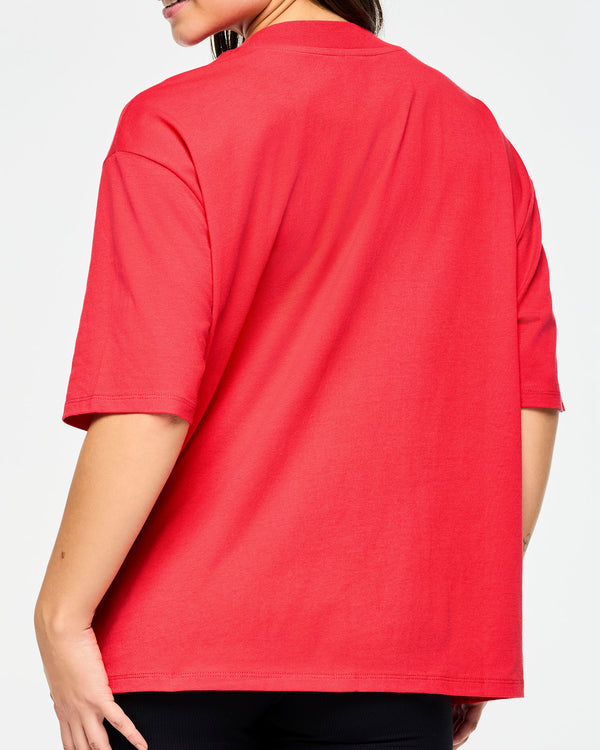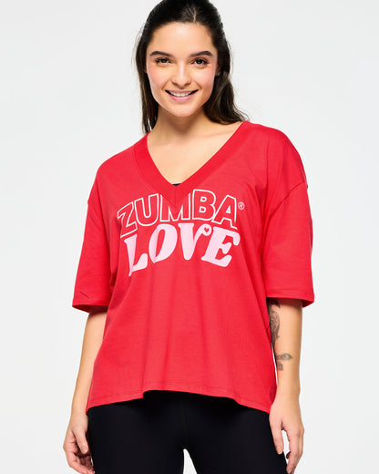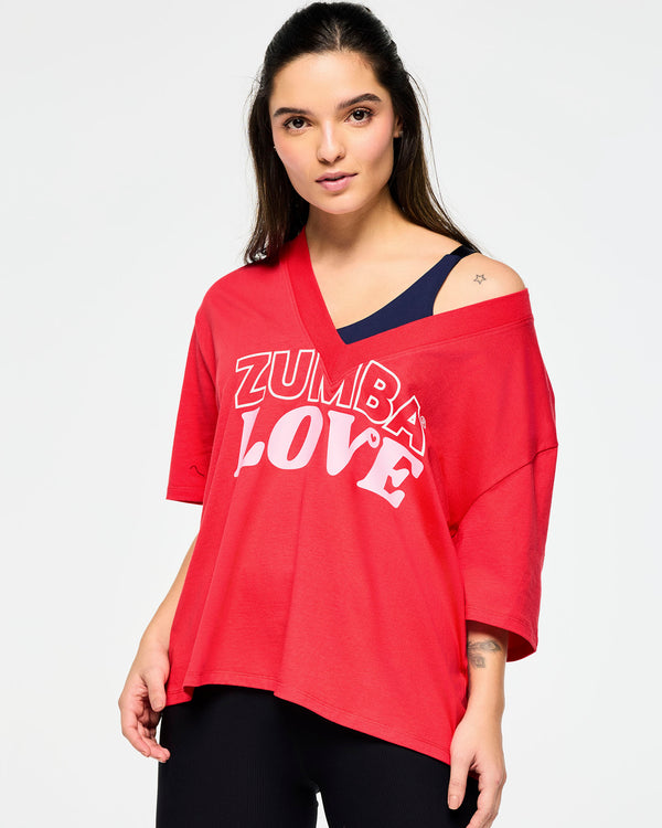 Experience the ultimate comfort and style with the Zumba XO Love Top featuring a rib knit V-neck collar, exclusive graphic print, and lightweight Jersey fabric. The oversized fit and regular length will keep you feeling confident and free to move during your Zumba workouts.